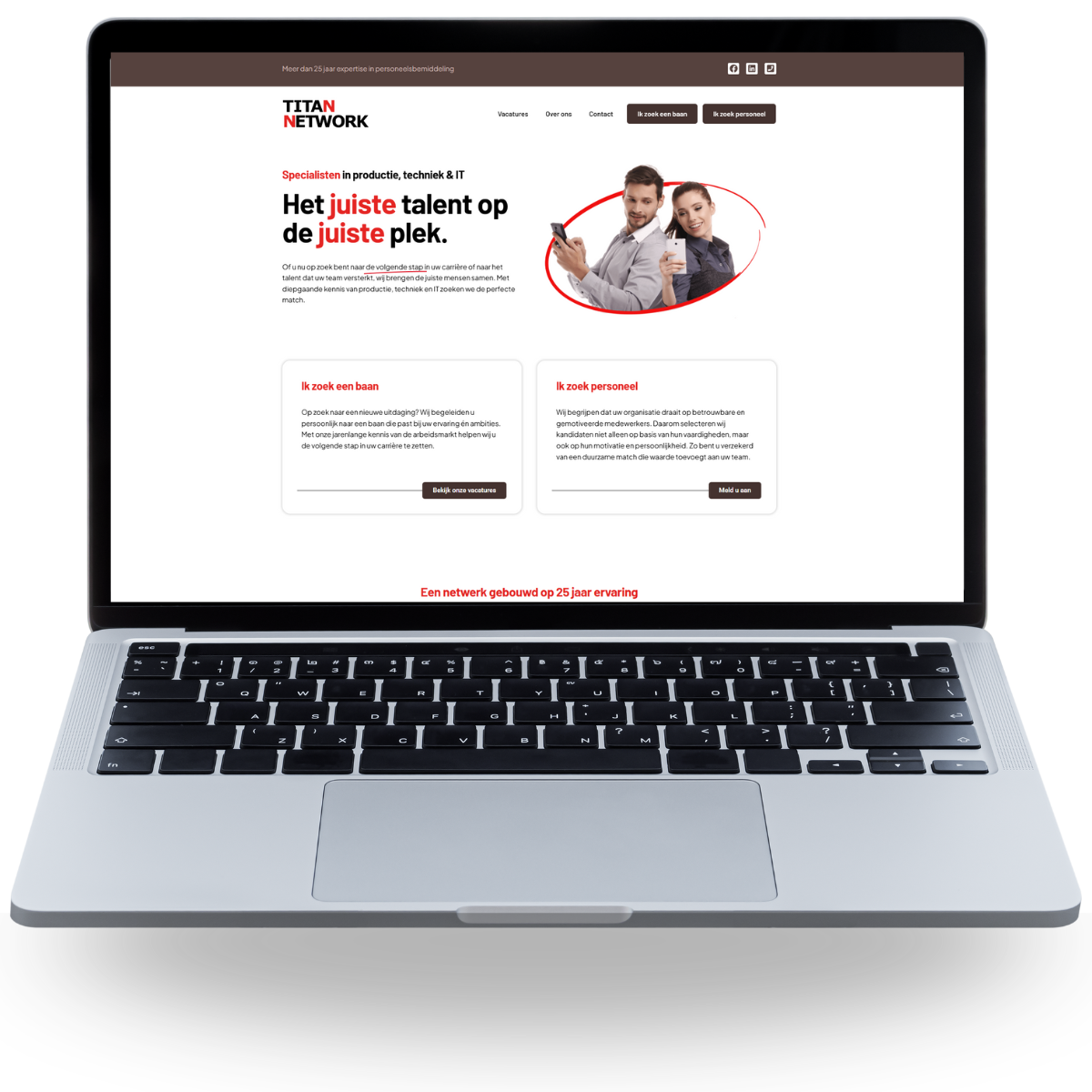 We startten met een scherpe positionering: wie is Titan Network, voor wie zijn jullie er en waarom kiezen klanten en kandidaten voor jullie? Op basis daarvan hebben we de structuur, navigatie en content van de website ontworpen. Bezoekers vinden nu snel wat ze zoeken, of het nu gaat om diensten, aanmelden of actuele vacatures.